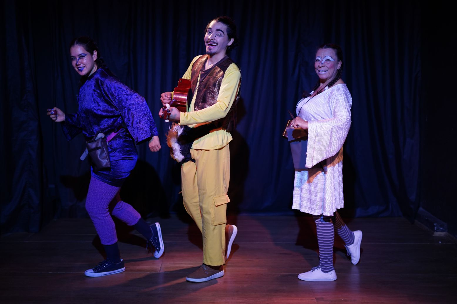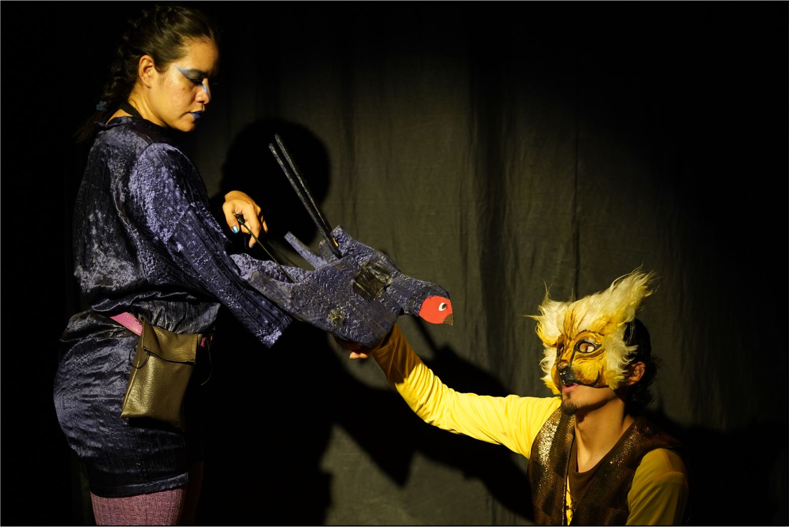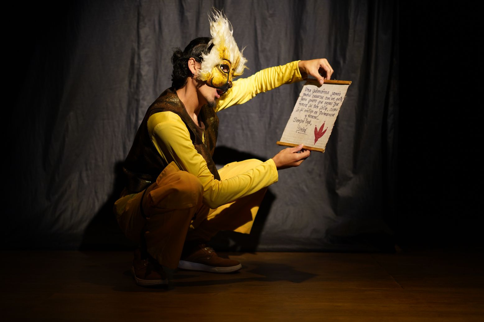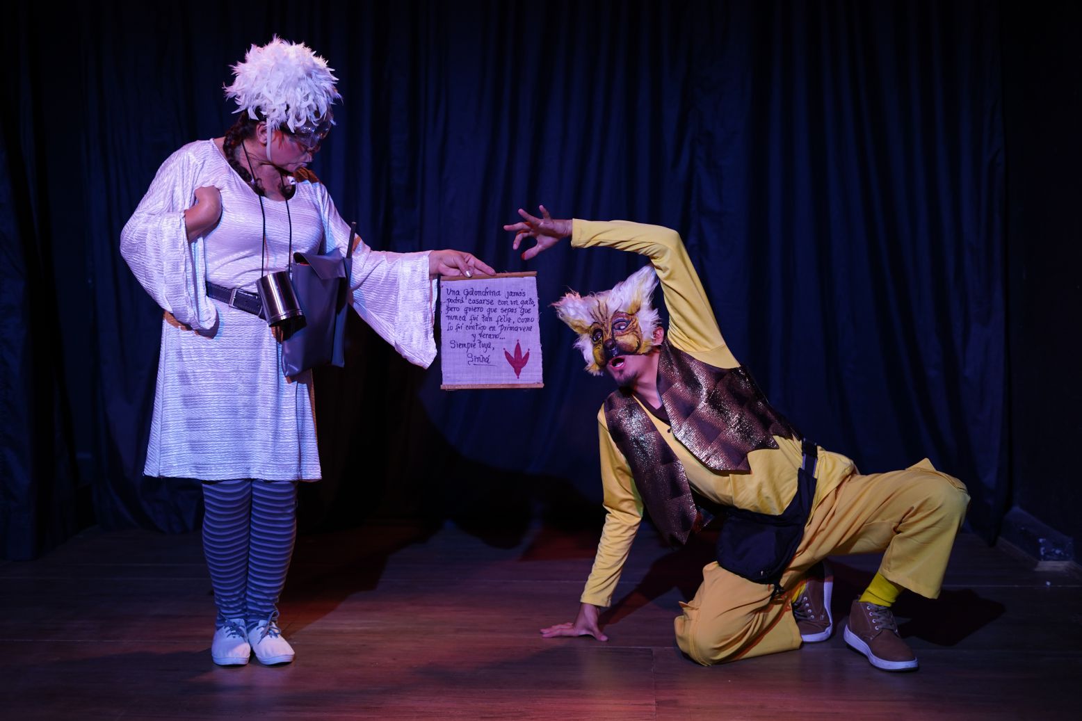 La puesta en escena es una invitación al juego y a la imaginación a través de los tres juglares que narrarán la historia de amor entre el gato y la golondrina.